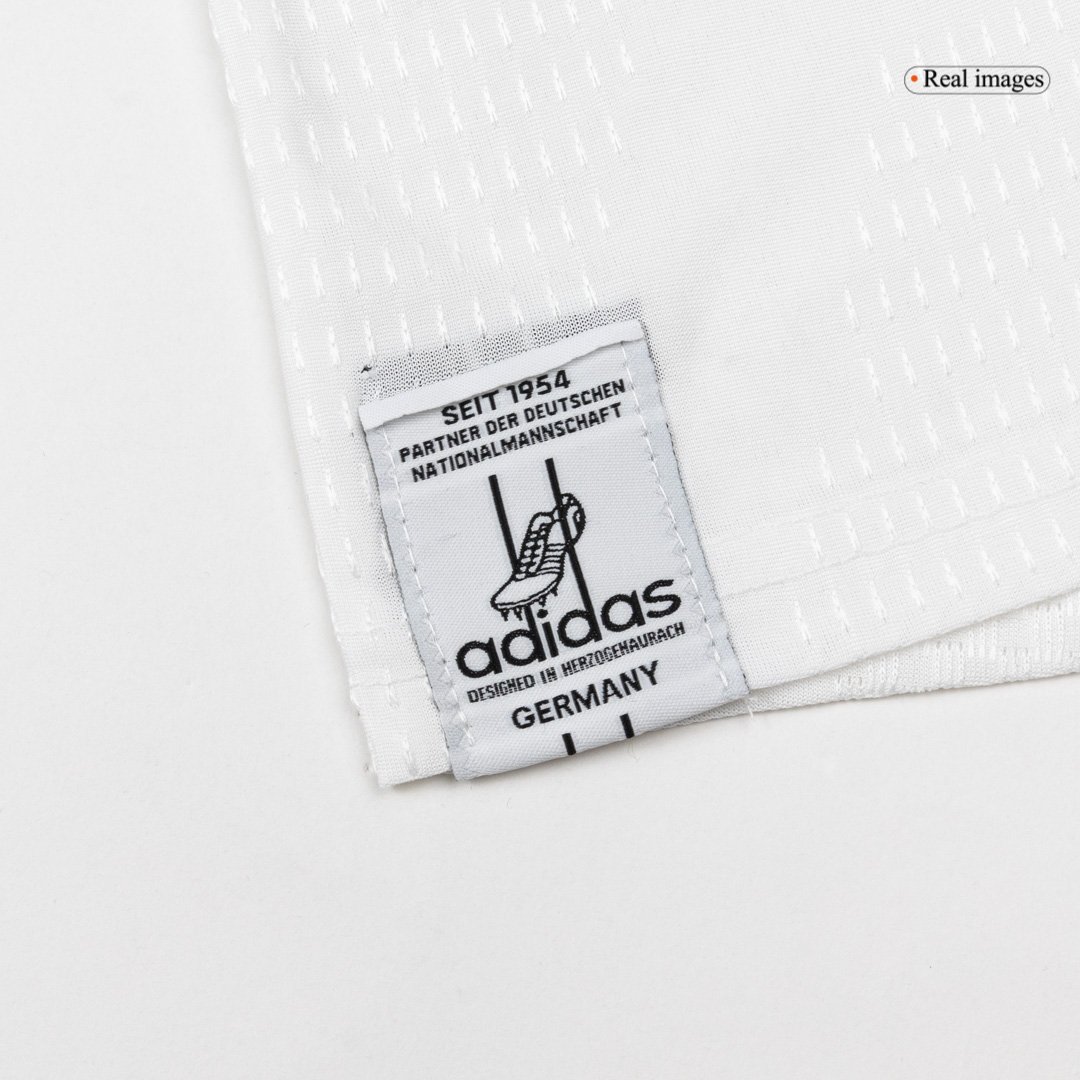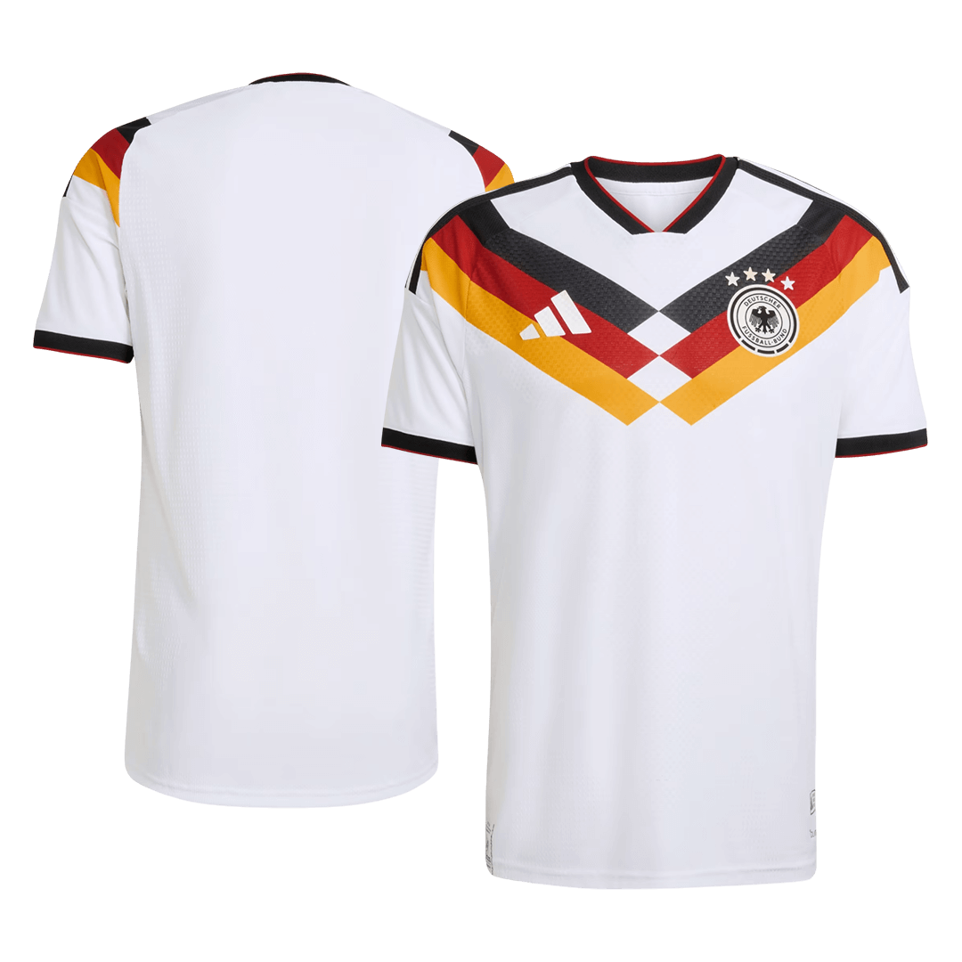 The Germany Home Soccer Jersey World Cup 2026 celebrates legacy and victory, paying homage to the iconic 1990 and 2014 World Cup-winning kits. Featuring a clean white base with black, red, and yellow accents, this Germany jersey showcases a bold tricolor V-design running from the shoulders to the chest—symbolizing unity and strength. The special DFB authentic badge and Adidas “Adolf Dassler” logo add an exclusive touch to this modern classic.