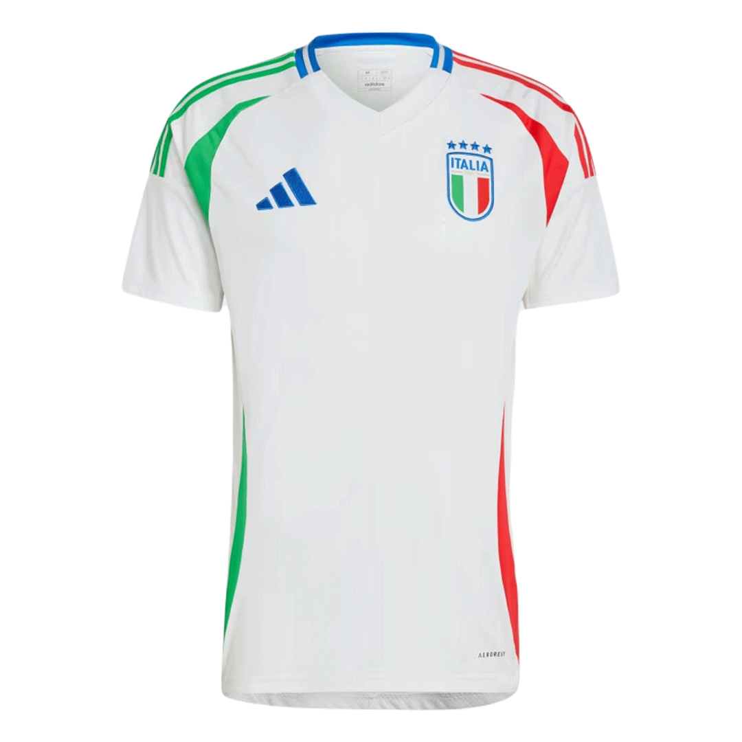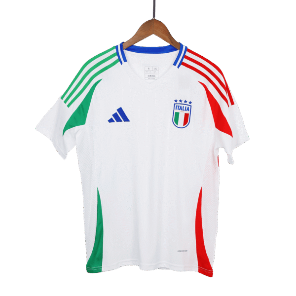The Italy 2024 away jersey combines a white base with blue brand logos and the jersey is adorned with the national crest on the chest and the green 3-Stripes on the sleeves. Italy jersey EURO 2024 is inspired by the 2006 World Cup jersey, with a three-color splicing design – green, white and red. On the lower right corner of the Ital jersey EURO 2024 is a new white/gold jersey badge.
