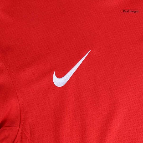 The cheap Portugal jersey EURO 2024 has a classic red color, combined with green and black applications, plus a light beige for the Sowoosh, as well as the names and numbers.  The design  of Portugal jersey is based on the Portuguese flag and the national cultural creativity, showing the long history of Portuguese football. Portugal is written in elegant script on the inside of the collar and makes fans proud of the Portuguese team.